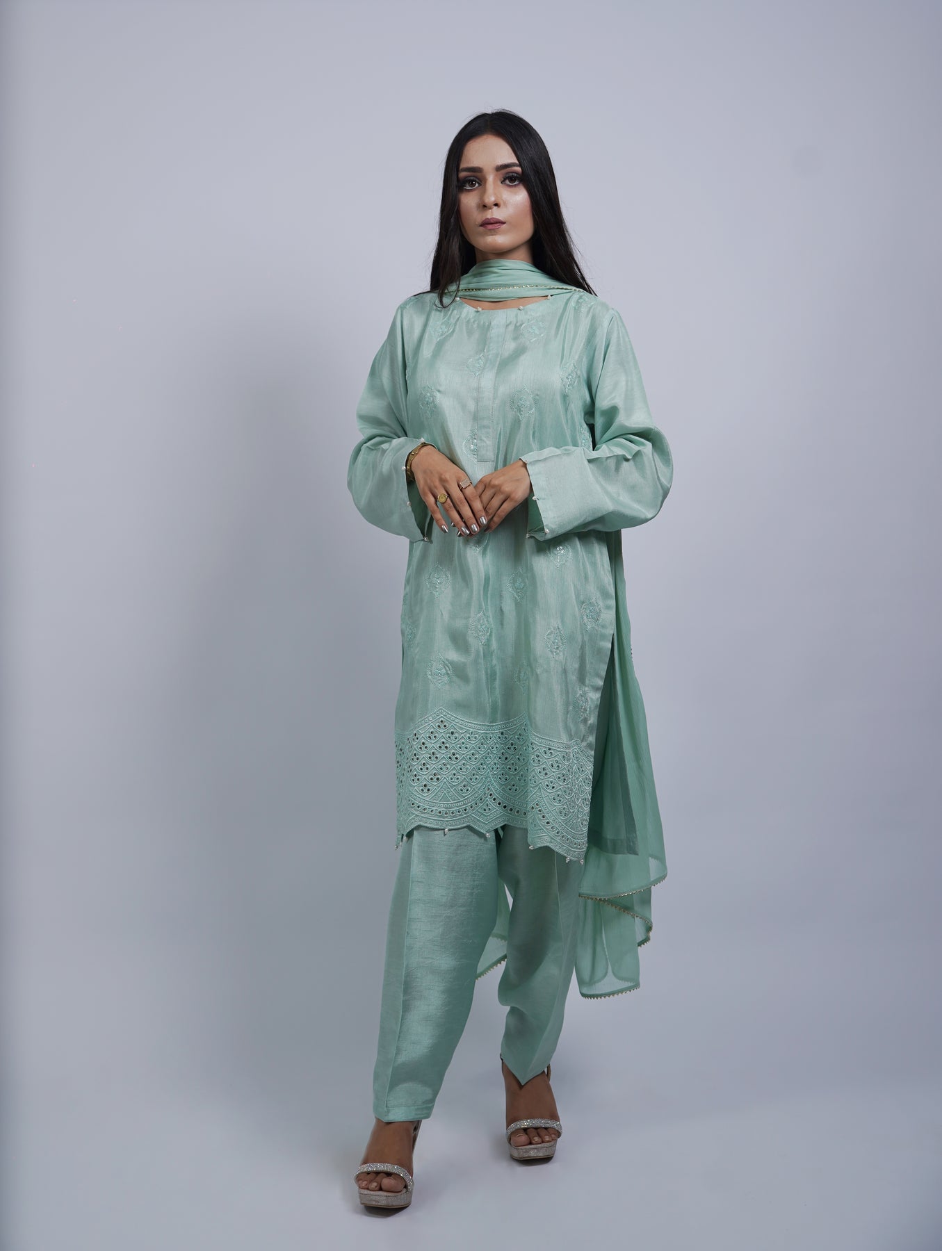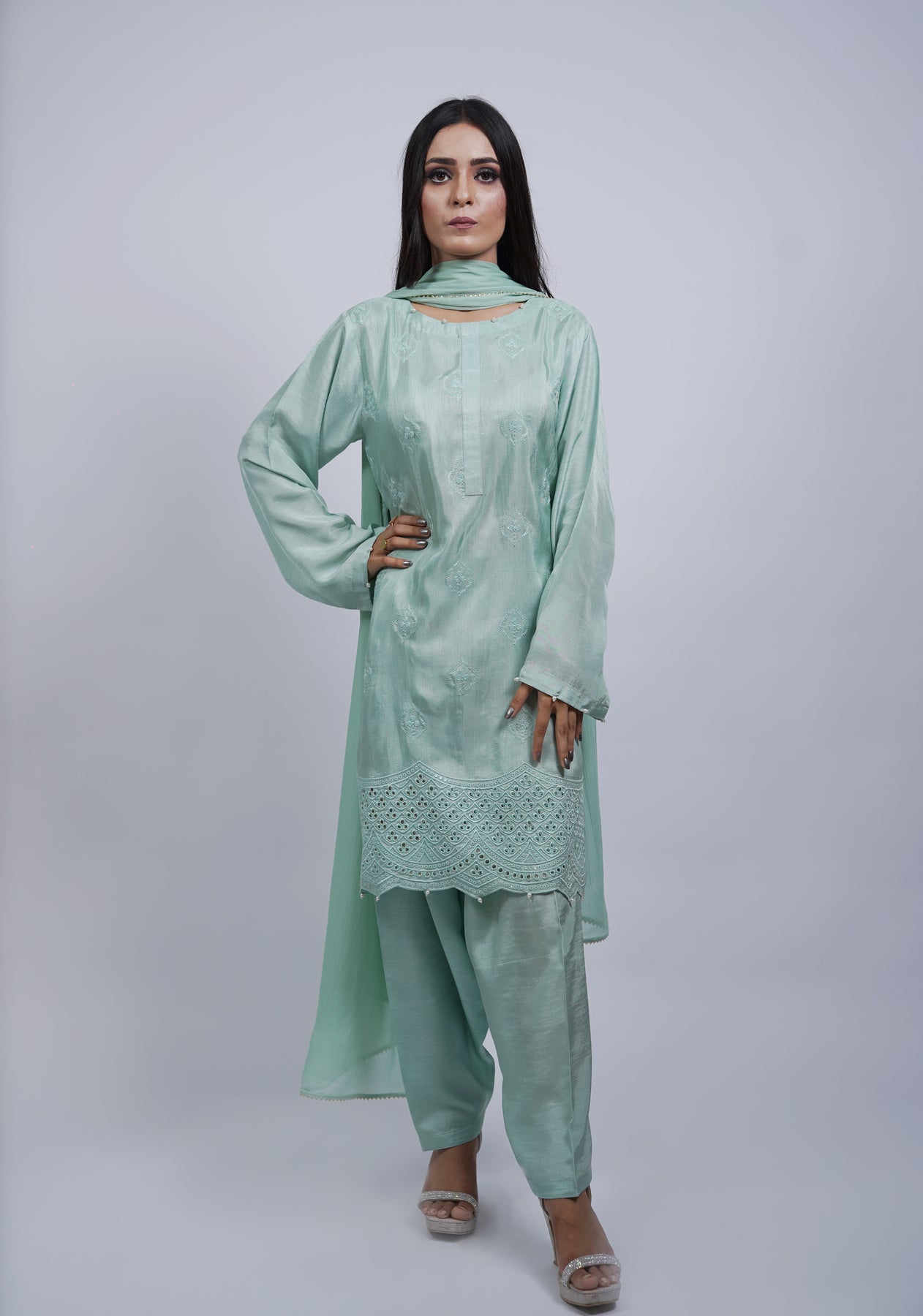 A graceful bottle green karandi outfit featuring subtle handwork on a textured base. Paired with a matching trouser and apple silk dupatta, it’s ideal for relaxed gatherings and simple festive days.