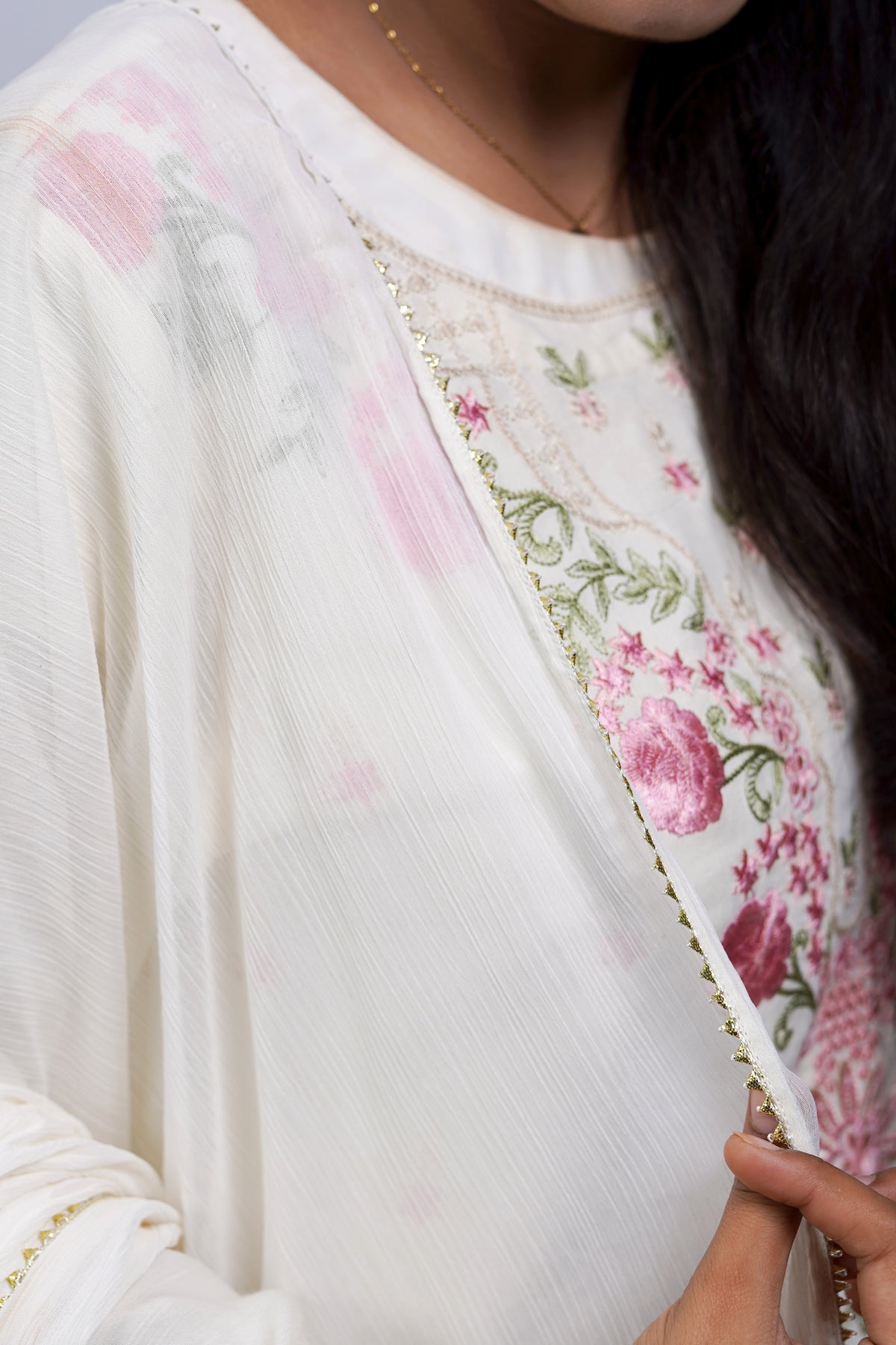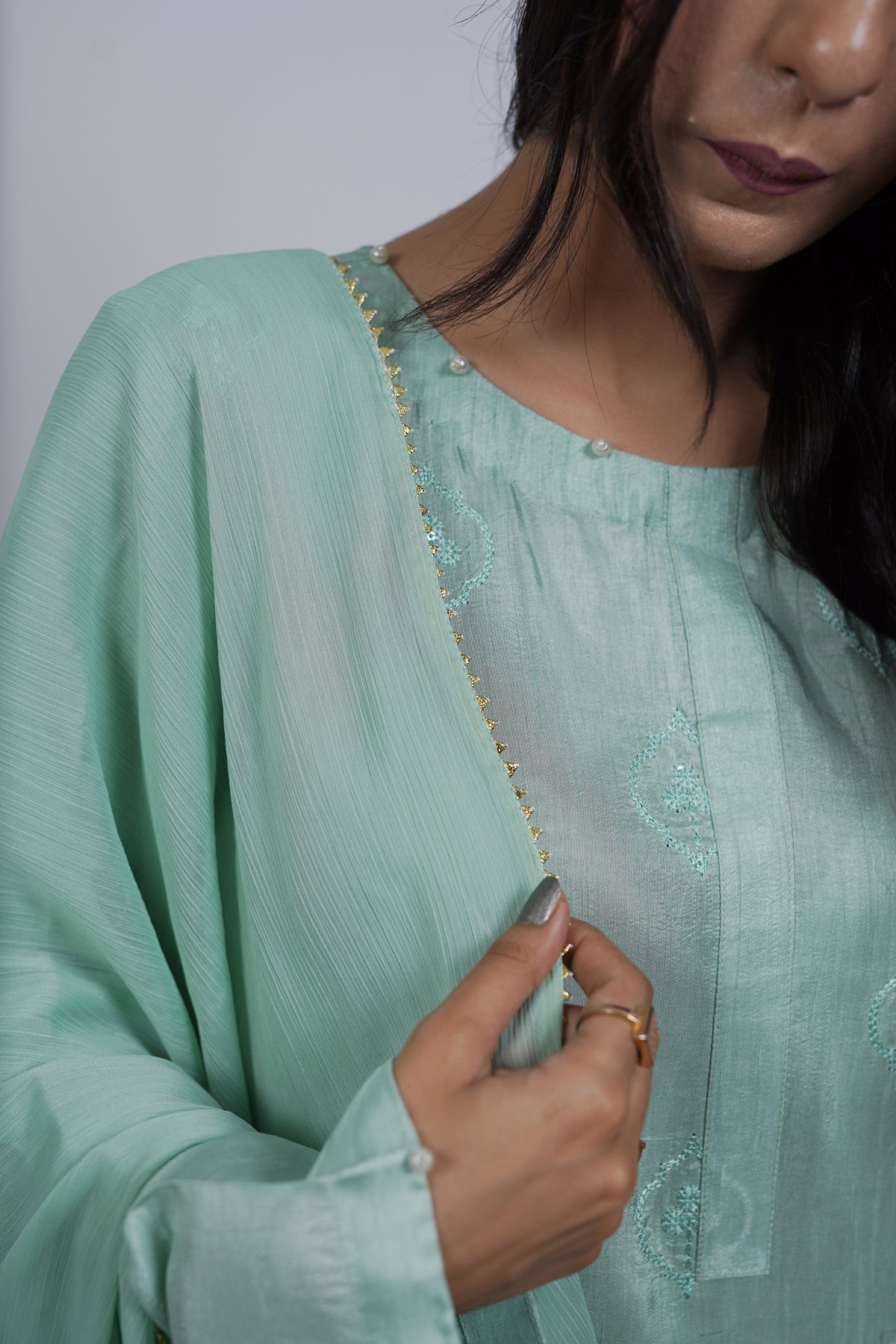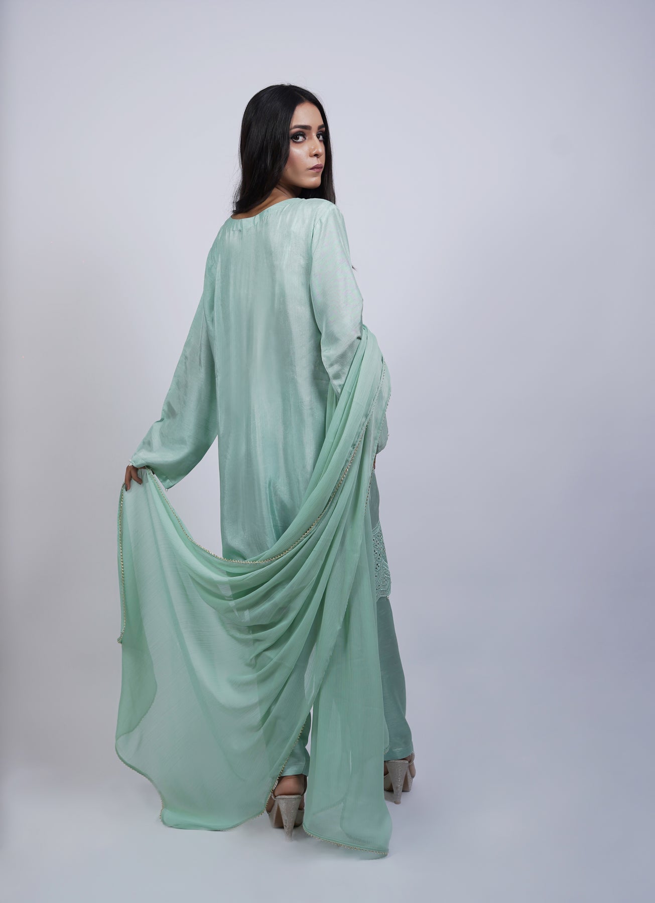 A black Korean silk outfit with light embroidery that adds just the right amount of detail. Styled with a cotton-silk trouser and apple silk dupatta for comfortable evening wear.