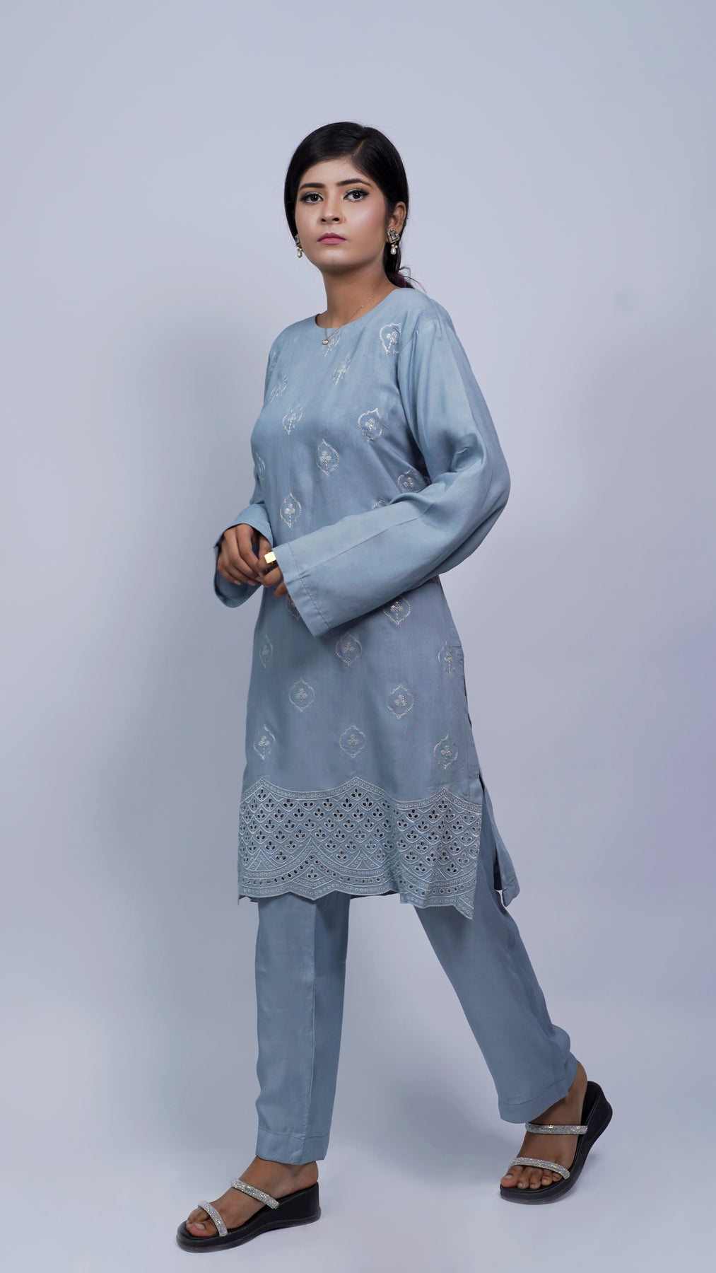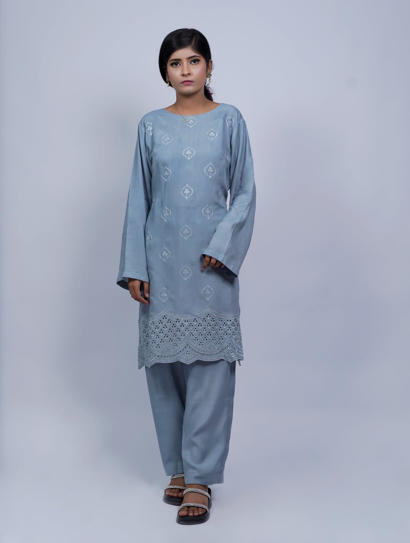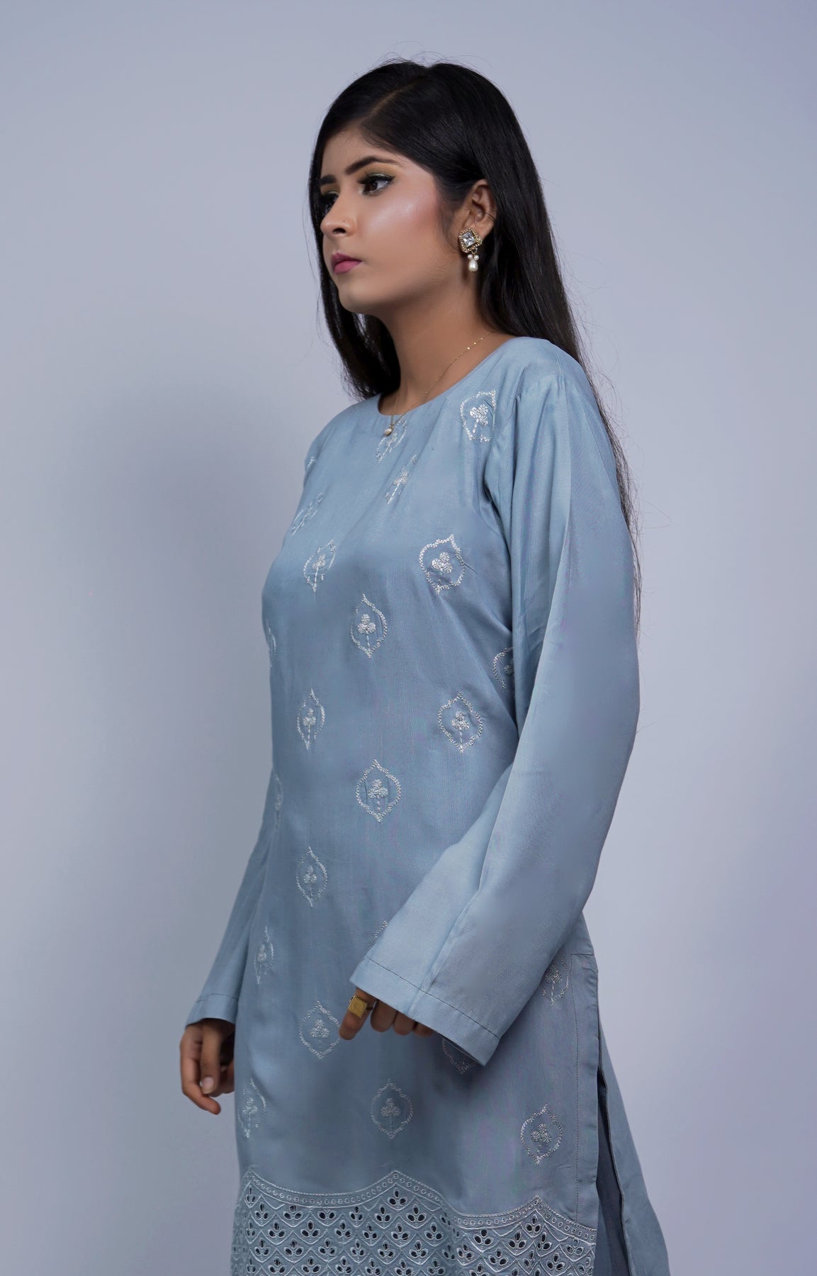 A soft light blue outfit with fine hand embroidery that gives it a slightly elevated look. Comfortable yet presentable for daytime events and semi-formal wear.